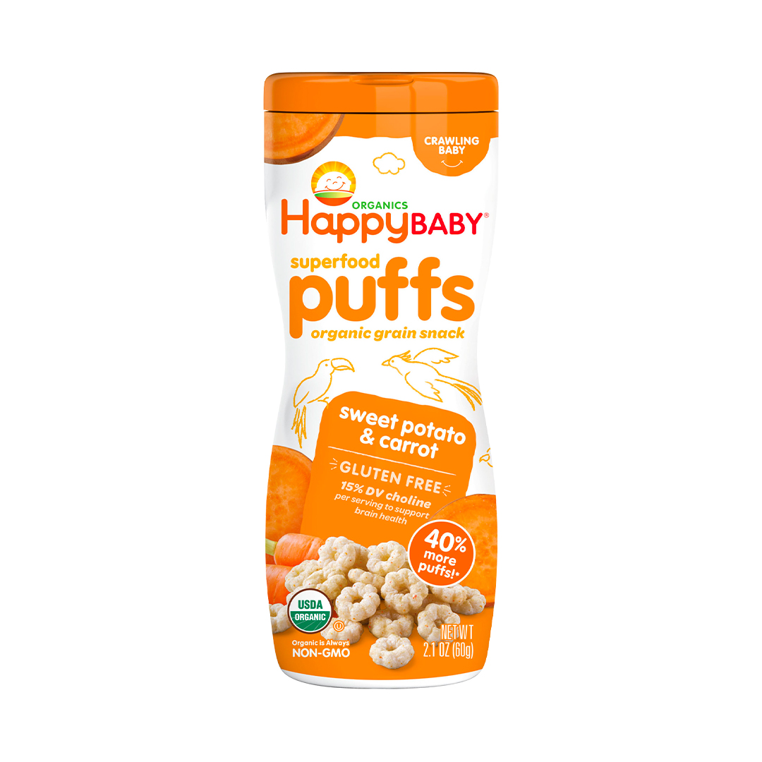 Hojaldres De Camote Y Zanahoria, Espolvoreados con polvos de camote y zanahoria, ligeramente endulzados con concentrado de jugo de fruta real y enriquecidos con vitaminas y minerales, HappyBABY